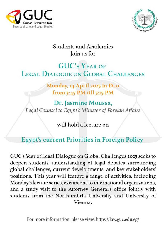 The GUC's Faculty of Law and Legal Studies Public International Law Department, led by Dr. iur. Nora Salem, would like to announce and invite you to the launch of GUC’s Year on Legal Dialogue 2025, which will start off by a lecture on 'Egypt's current Priorities in Foreign Policy' by the Legal Counsel to the Minister of Foreign Affairs, Dr. Jasmine Moussa, on Monday, 14 April 2025, in D1.0 from 3:45 till 5:15 PM.